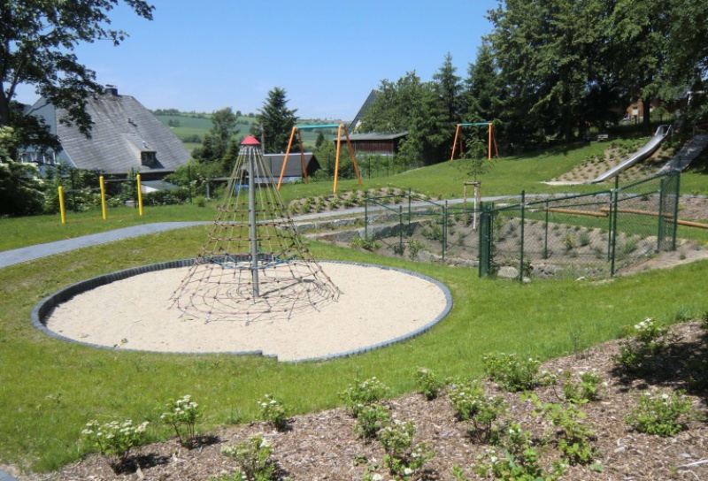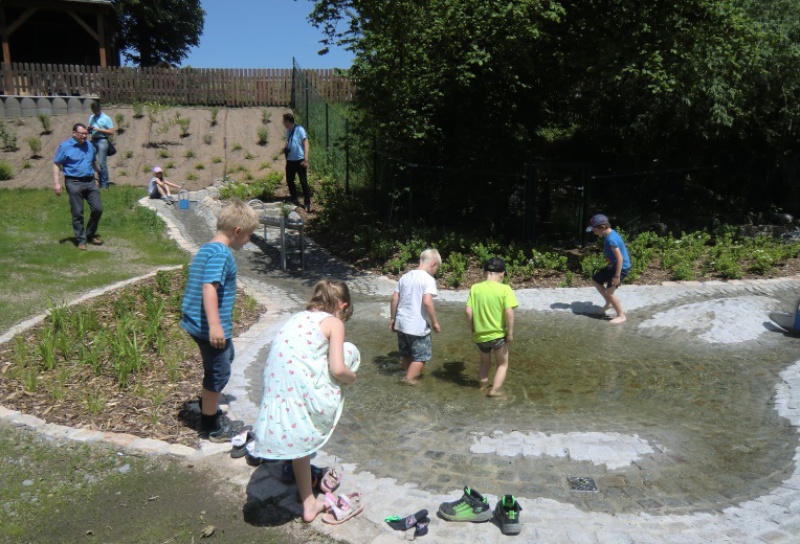 Der bereits vorhandene Spielplatz wurde umgestaltet und unter anderem mit einem Spielturm, einer Hangrutsche, einer Schaukel und einem Wassermatschbereich